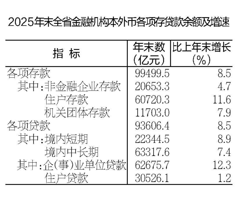 全年社会融资规模增量11656.8亿元;年末社会融资规模存量131276.4亿元,比上年末增长9.3%。年末金融机构本外币存款余额99499.5亿元,比年初增加7778.1亿元,增长8.5%,其中人民币存款余额98269.6亿元,比年初增加7477.3亿元,增长8.2%;金融机构本外币贷款余额93606.4亿元,比年初增加7345.5亿元,增长8.5%,其中人民币贷款余额93317.5亿元,比年初增加7309.0亿元,增长8.5%。
